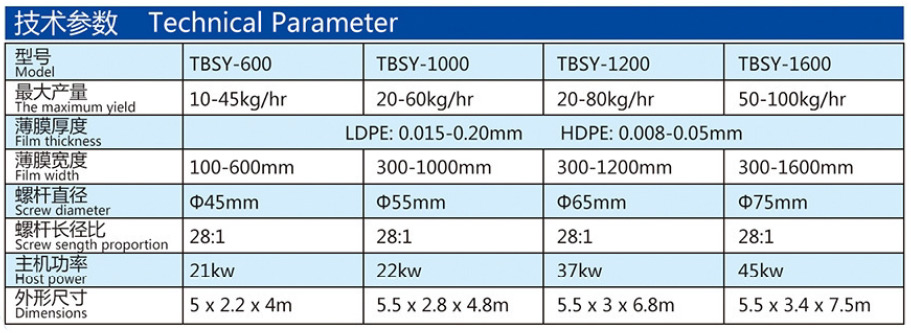 機(jī)器特性 吹制各種規(guī)格的低密度聚乙烯、高密度聚乙烯和線性低密度聚乙烯塑料薄膜,廣泛應(yīng)用于食品百貨、日用、化工、針紡品、購物禮袋和工業(yè)包裝。機(jī)簡、螺桿采用38CrMoAl合金材料經(jīng)氮化處理精密加工而成