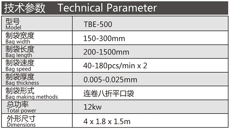 機(jī)器特性 此設(shè)備為生產(chǎn)連卷八折平口垃圾袋的專用設(shè)備,雙通道高速無拉伸底封好,收卷整齊,個(gè)數(shù)準(zhǔn)確,手動手卷。主動放料,薄膜張力穩(wěn)定此設(shè)備采用全鋼板一體而成,用電220v照明電即可。